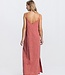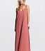 De fijne spaghettibandjes zorgen voor een subtiele, zomerse look en laten de schouders mooi uitkomen. Tegelijkertijd geeft de lange, soepel vallende snit de jurk een elegante flow bij elke stap die je zet. De stof voelt licht en luchtig aan, waardoor de jurk heerlijk draagt, zelfs op warmere dagen.