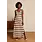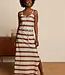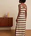 Het model is mouwloos en heeft fijne spaghettibandjes, wat de jurk een zomerse en elegante uitstraling geeft. De V-halslijn aan de voor- én achterkant zorgt voor een flatterend silhouet, terwijl de taille elastisch is afgewerkt voor een comfortabele pasvorm. De rok valt lang en zwierig tot op de enkels, waardoor de jurk mooi meebeweegt bij elke stap.