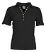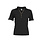De zwarte kleur geeft deze top een krachtige, tijdloze uitstraling, terwijl de verfijnde goudkleurige knopen zorgen voor een subtiel vleugje glamour. De klassieke polokraag en V-hals geven het ontwerp een sportieve basis, die wordt verzacht door de opgerolde mouwen voor een moderne, nonchalante touch. Het resultaat is een gebalanceerde look die zowel comfortabel als chic is.
